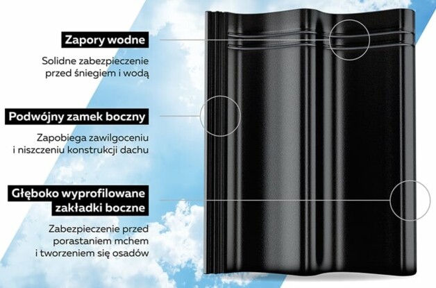 Padający deszcz nie pozostawia smug nawet na dachówce o czarnej barwie i czyści ją w naturalny sposób, a ryzyko zarastania dachówki mchem jest niewielkie.