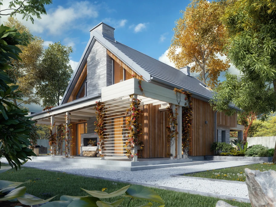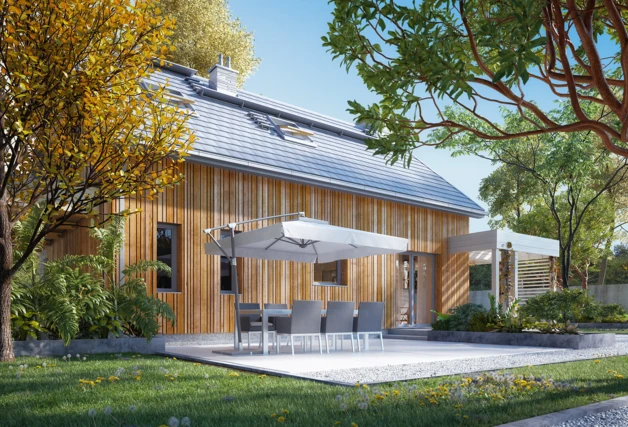 W przypadku projektu Weranda 4 – domu z nowoczesną aranżacją elewacji – świetnie sprawdzą się produkty o prostym designie. Znakomitą propozycją będą więc dachówki płaskie, przykładowo może być to SIMPLA – model wyróżniający się pięknym wyglądem, modną formą i ponadprzeciętnie szczelnymi zamkami bocznymi. Do nowoczesnego charakteru projektu WERANDA 4 doskonale pasować będzie również dachówka KODA dostępna w gamie nowoczesnych kolorów.